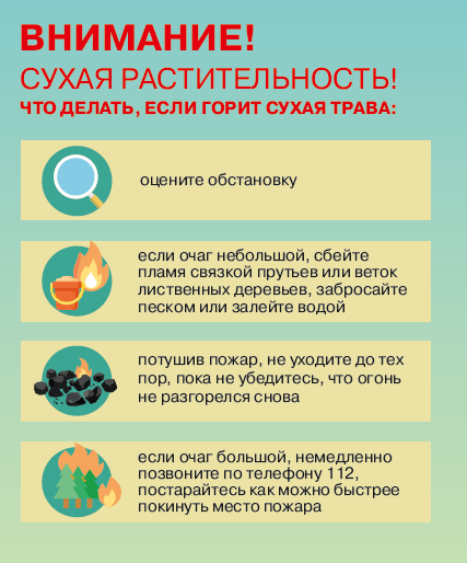 • Если вы заметили пожар – не проходите мимо. Начинающую гореть траву вы сможете потушить самостоятельно. При тушении подручными средствами можно сбивать пламя с кромки пожара связкой прутьев или веток лиственных деревьев, либо же забрасывать кромку пожара песком.
