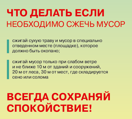 • Не выжигайте траву. Кроме того, что это вредно для растений и животных, огонь может быть опасен и для людей.
