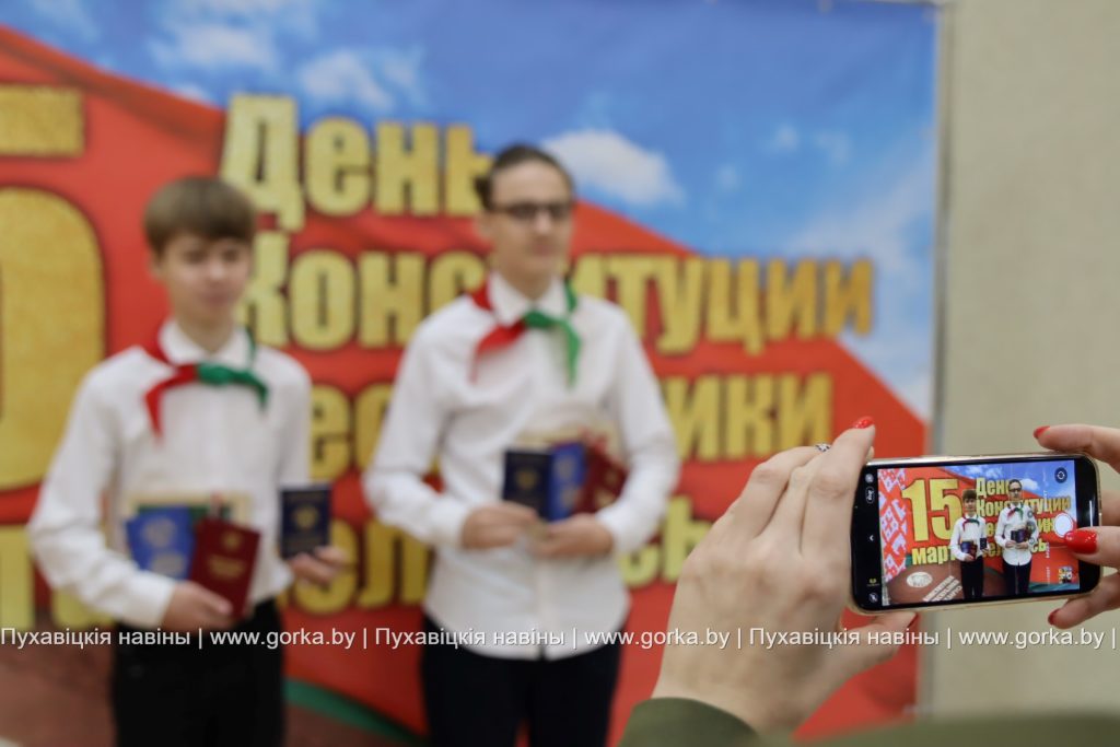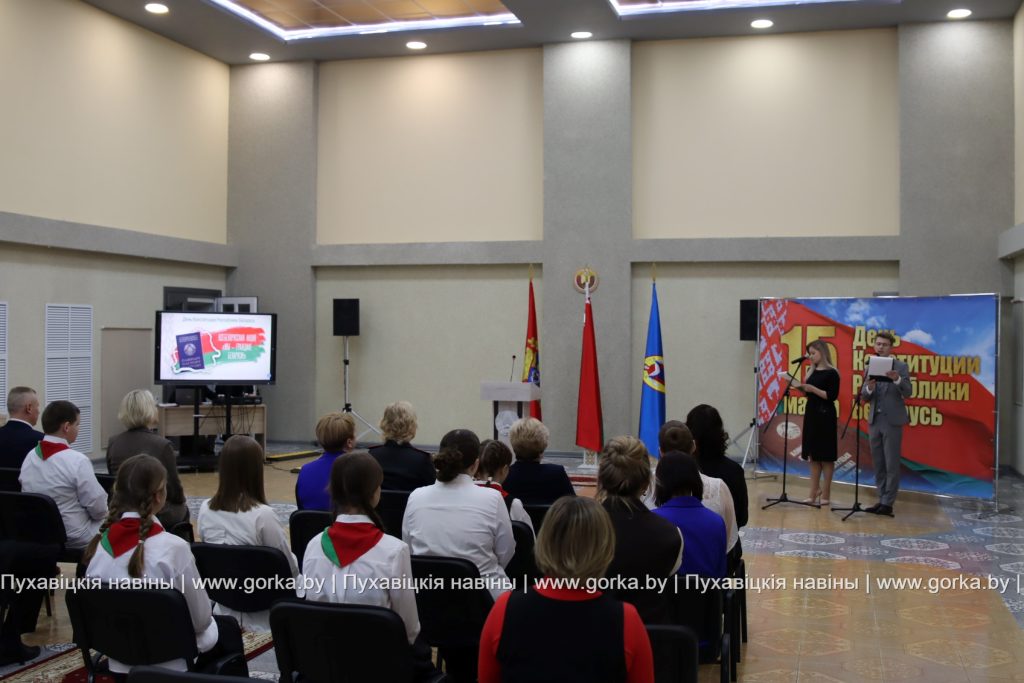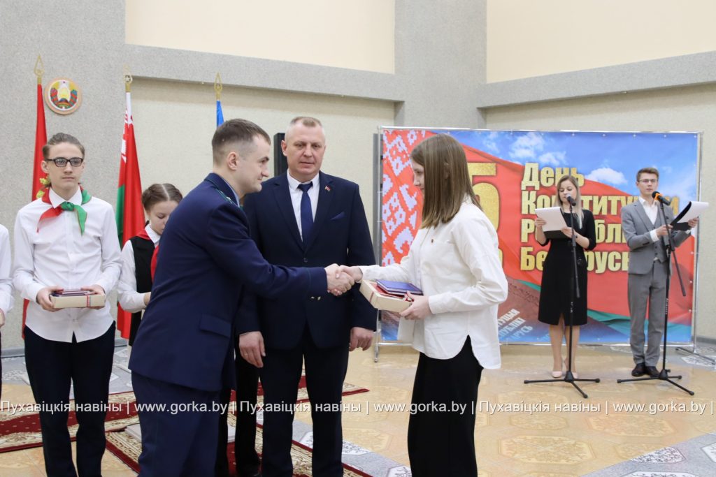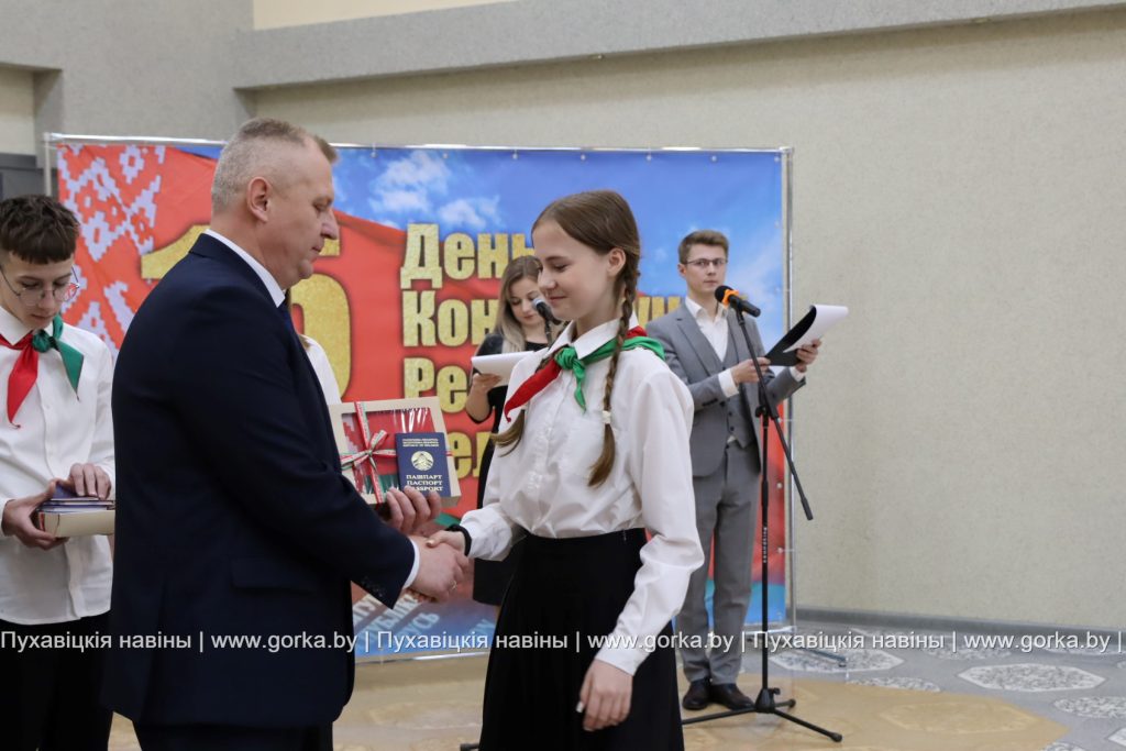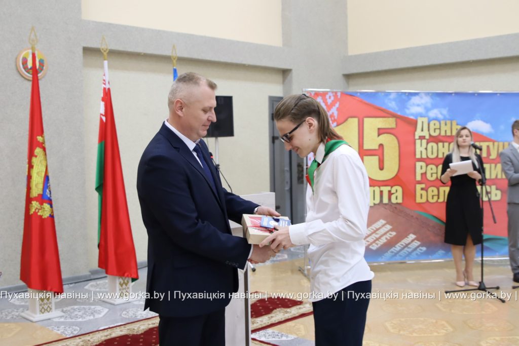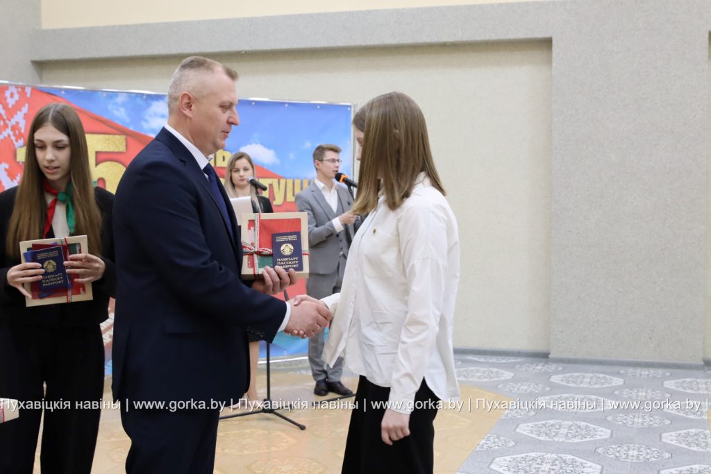 В районном центре культуры накануне Дня Конституции состоялась торжественная церемония вручения паспортов в рамках акции «Мы — граждане Беларуси». По уже сложившейся традиции первый документ лучшим школьникам района, имеющим особые заслуги в учебе, спорте, общественной деятельности, вручил председатель Пуховичского районного исполнительного комитета Андрей Атрушкевич.