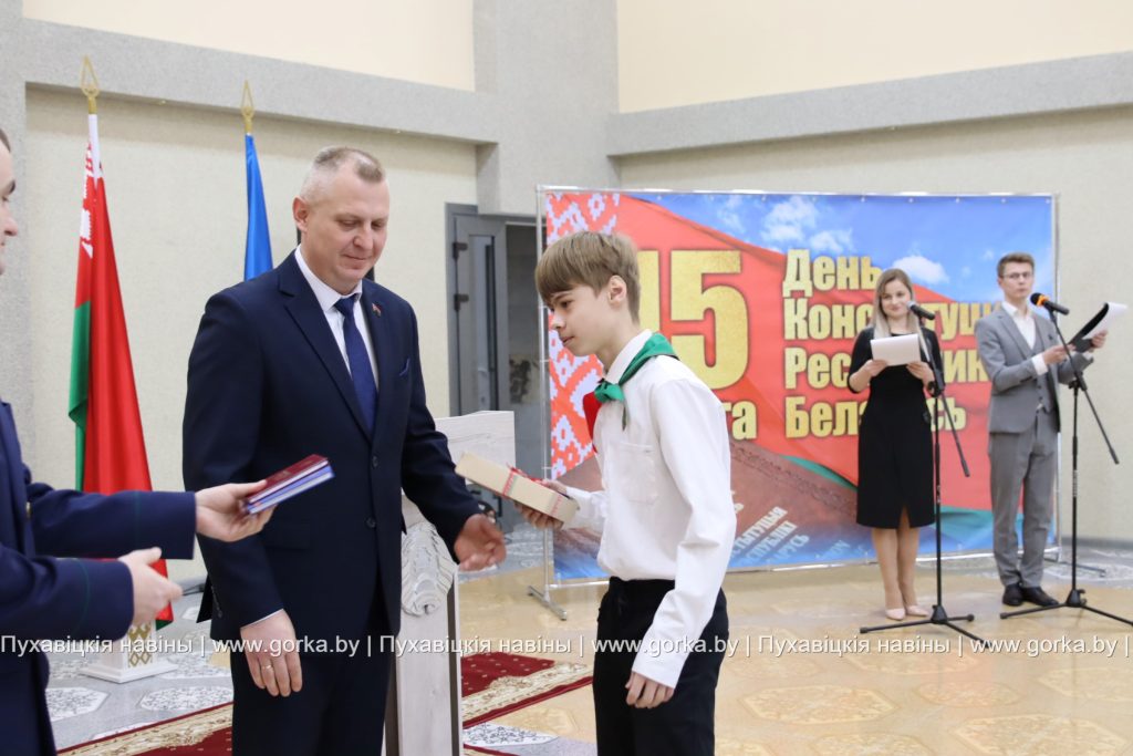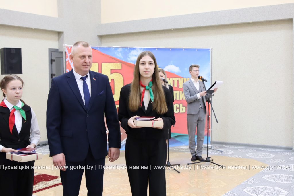 -Конституция Республики Беларусь стала основой всех Законов и политических институтов нашей страны, это символ нашей независимости и суверенитета. Для каждого из нас Конституция является гарантом прав и свобод. Дорогие ребята, вы настоящее и будущее нашей страны. Мы, взрослые, делаем все, чтобы для вас были открыты все дороги , чтобы вы жили в независимой и суверенной стране, и могли ею гордиться. Вам, молодежи, в скором будущем принимать важные решения. Убежден, что вы сможете сохранить духовные и культурные ценности, и самое главное — мир на нашей земле.