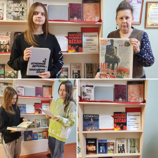 Во время мероприятия библиотекарь обращала внимание школьников на тот факт, что свобода родной земли досталась нашему народу очень дорогой ценой, призвала бережно хранить историческую память о тех страшных годах и нечеловеческих страданиях белорусского народа, выстоявшего в Великой Отечественной войне. В заключение мероприятия школьникам была рекомендована литература о хатынской трагедии: «Я з вогненнай вёскі» Алеся Адамовича, «Жаворонки над Хатынью» Елены Кобец-Филимоновой. Особое внимание было уделено книге Артура Зельского «Хатынь».
