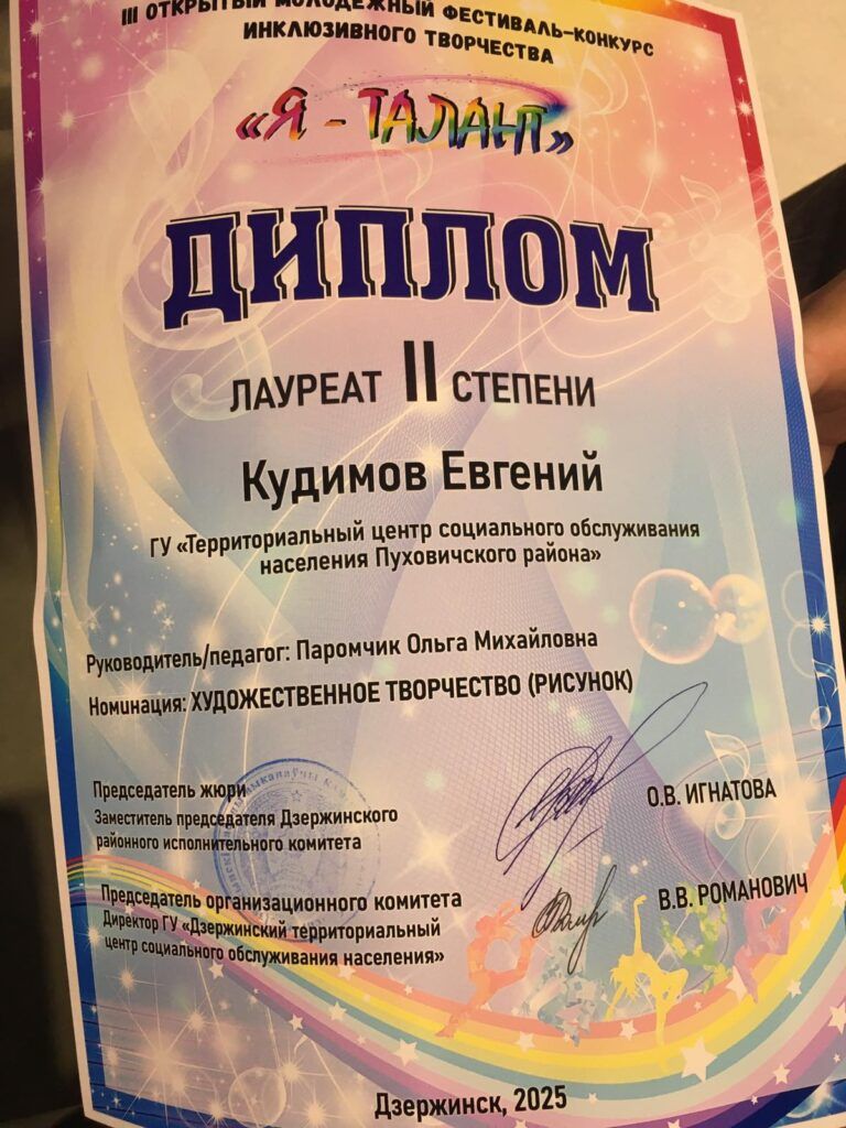 Кудимов Евгений, посещающий отделение обеспечения дневного пребывания для инвалидов и граждан пожилого возраста, несмотря на инвалидность, принял участие в Третьем открытом молодежном фестивале-конкурсе инклюзивного творчества «Я – талант», проходившем в г. Дзержинске, где смог продемонстрировать свои выдающиеся способности и завоевать диплом лауреата II степени. Его выступление стало ярким примером того, что творчество не имеет границ, а талант и упорство способны преодолеть любые трудности. Евгений не только раскрыл свой потенциал, но и вдохновил других участников на новые достижения, доказав, что искусство объединяет людей вне зависимости от их физических возможностей. Этот успех – важный шаг в развитии инклюзивного творчества и признание значимости таких фестивалей для социализации и самореализации людей с ограниченными возможностями. Поздравляем!!!