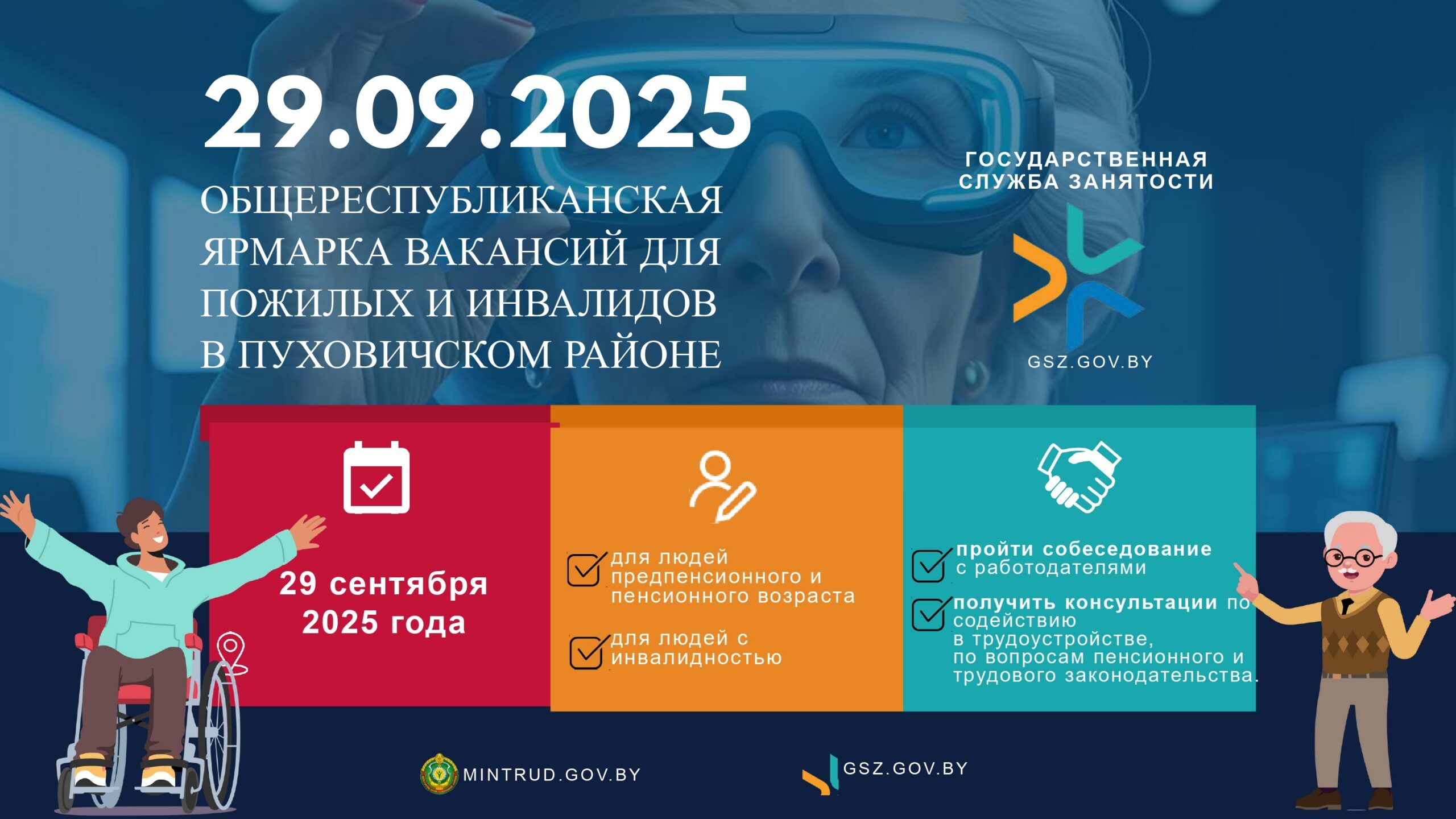 В рамках проведения республиканской «серебряной» ярмарки вакансий 29 сентября 2025 года пройдет ярмарка вакансий по вопросу трудоустройства граждан предпенсионного и пенсионного возраста, инвалидов, имеющих профессиональные и трудовые рекомендации.