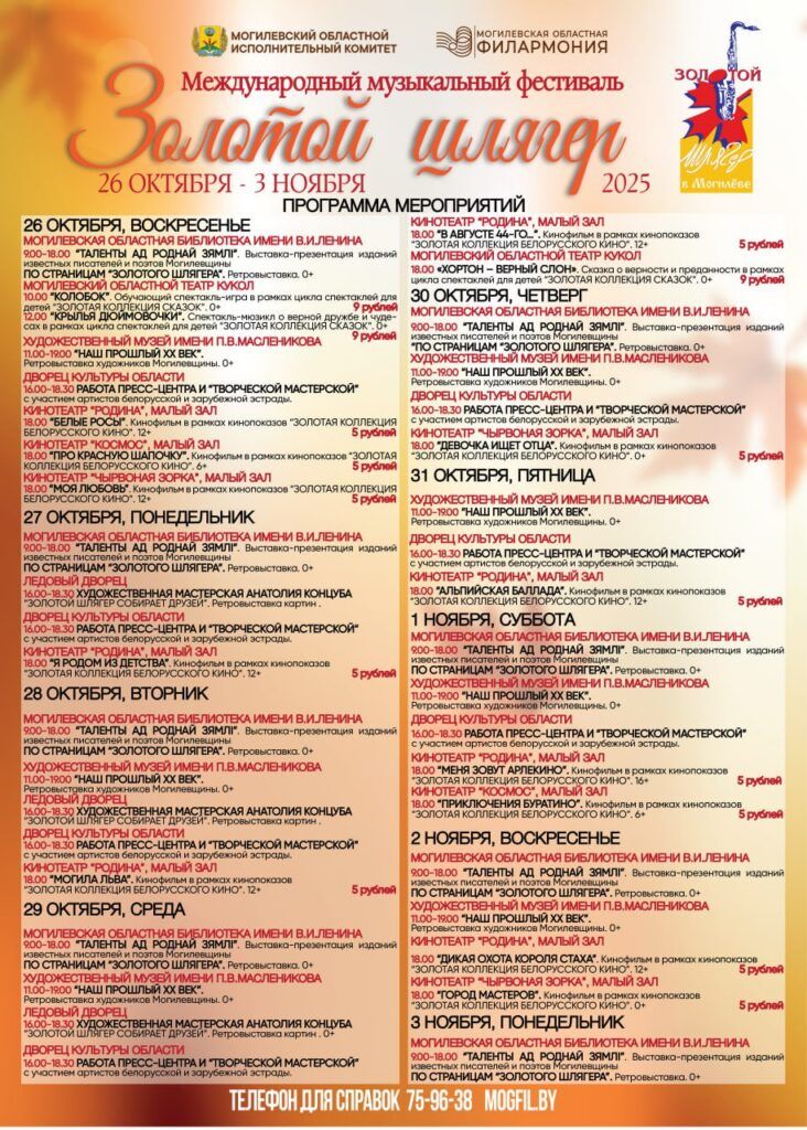 В Могилевской областной библиотеке имени В.И. Ленина организуют литературно-музыкальную встречу с поэтами Беларуси «Натхнёныя восенню», выставку-презентацию изданий знаменитых поэтов Могилевщины «Таленты ад роднай зямлі» и ретровыставку «По страницам «Золотого шлягера».Билеты можно приобрести в кассах Могилевской областной филармонии, Дворца культуры области, а также ticketpro.