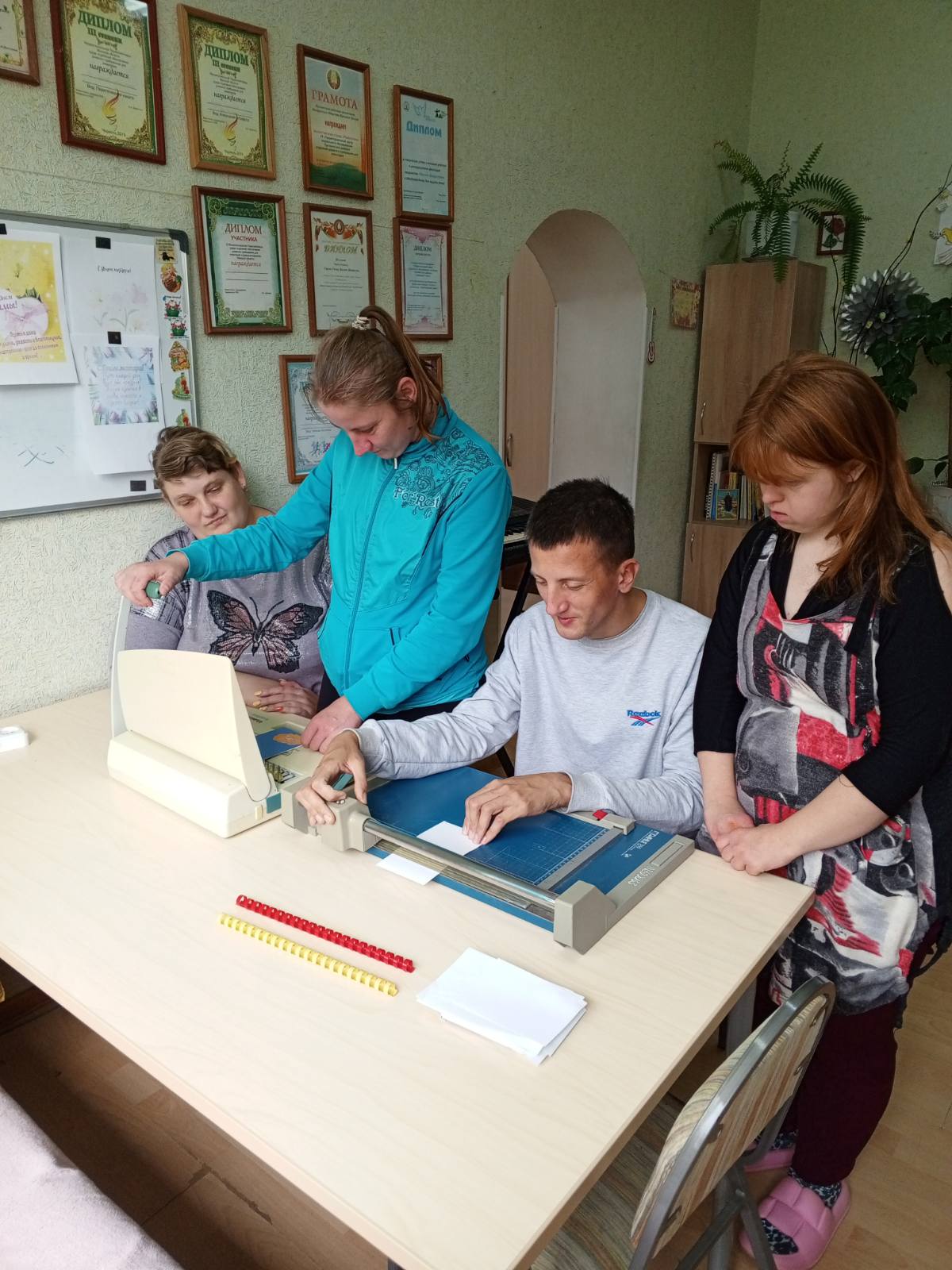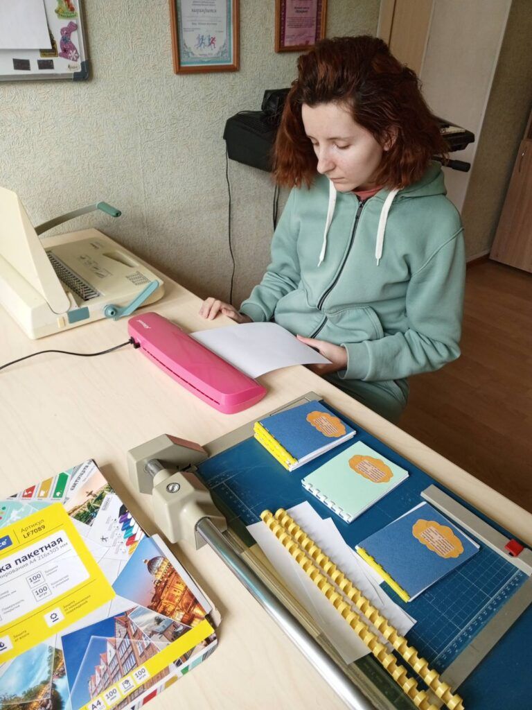 На занятии ребята научились правильно укладывать, обрезать листы бумаги для дальнейшего их применения, чтобы потом изготавливать красивые блокноты и брошюры.