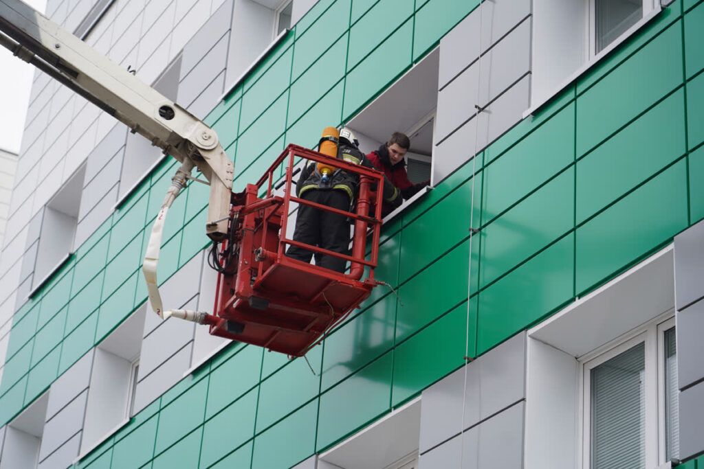 Один из условных пациентов был обнаружен у окна третьего этажа. Для его спасения применили автоколенчатый подъёмник – техника позволила безопасно спасти человека с высоты и передать медикам.