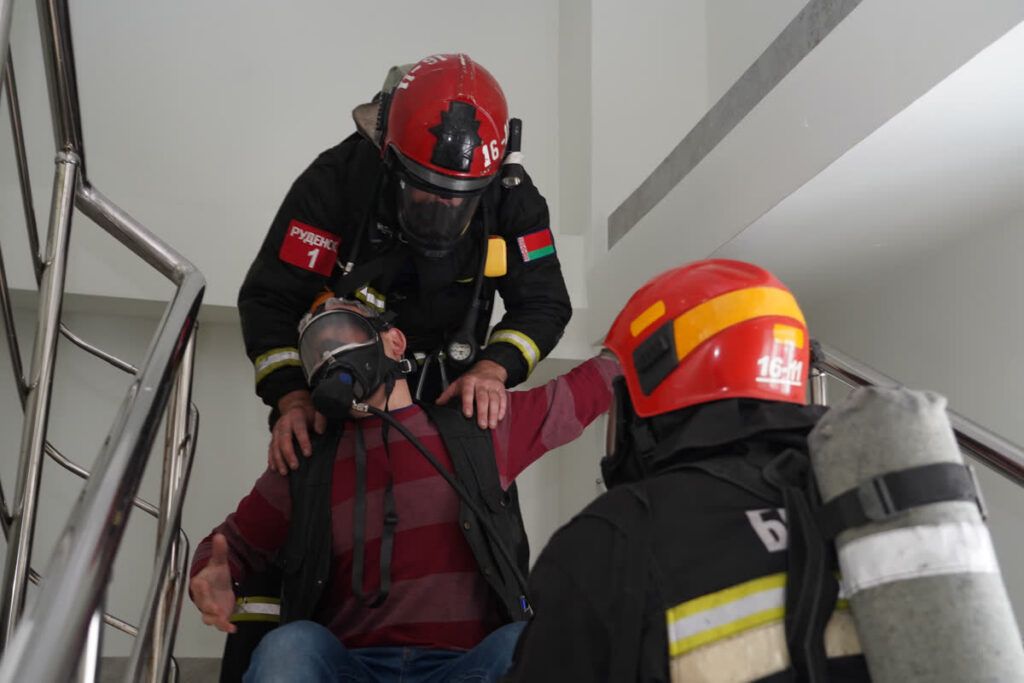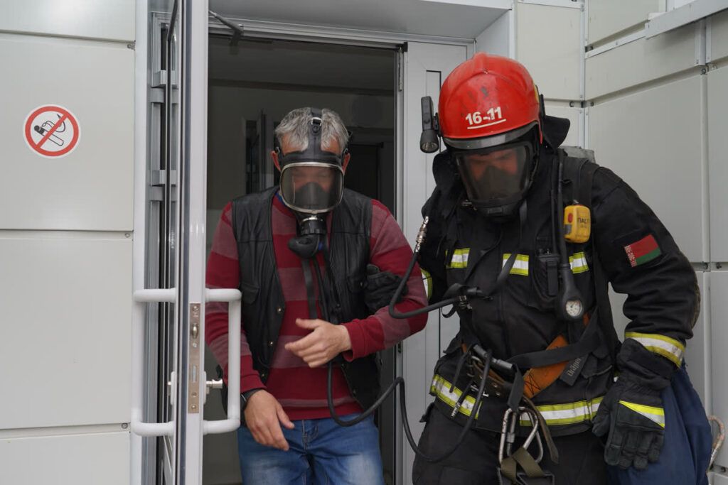 Второго пострадавшего вывели через задымлённый коридор с использованием маски спасаемого, что позволило обеспечить ему защиту органов дыхания и быстро доставить в безопасную зону.