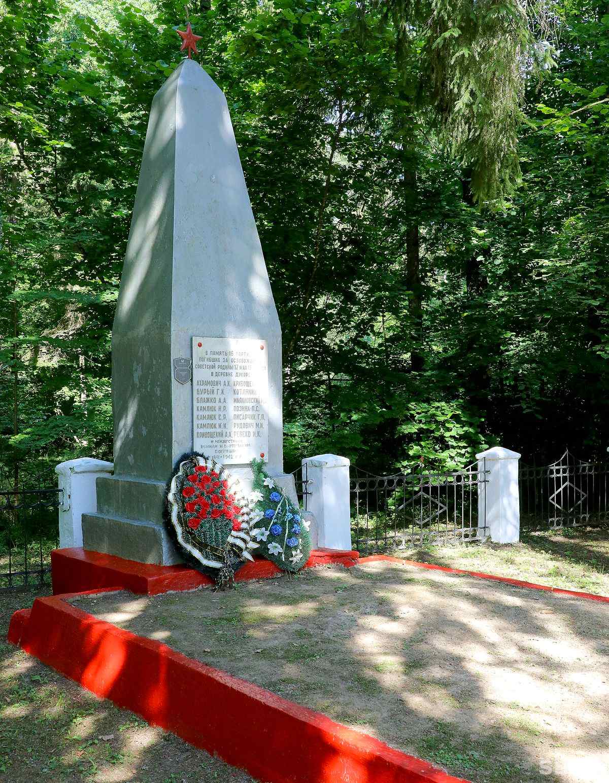![]() | Братская могила 1941, 1944 гг. д.Дукора , кладбище. В братской могиле похоронено 68 воинов, которые погибли в июле 1944 г. при освобождении района от немецко-фашистских захватчиков, и 1 партизан, погибший в 1941 г. Среди погибших воины 1-го гвардейского танкового Донского корпуса 65 армии 1-го Белорусского фронта. |