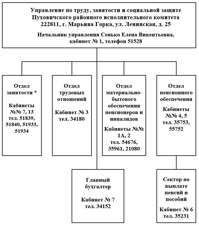 | * Отдел занятостиуправления по труду, занятости и социальной защите Пуховичского районного исполнительного комитета расположен по адресу: 222811, г. Марьина Горка, ул. Советская, д. 6 |